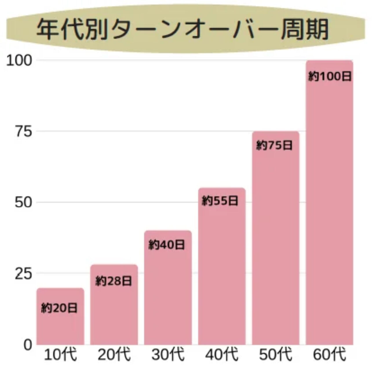 ※年齢と共に肌の生まれ変わりのサイクルが遅くなることがわかるターンオーバー周期。リジュランピールでターンオーバーサイクルを活性させることができます。